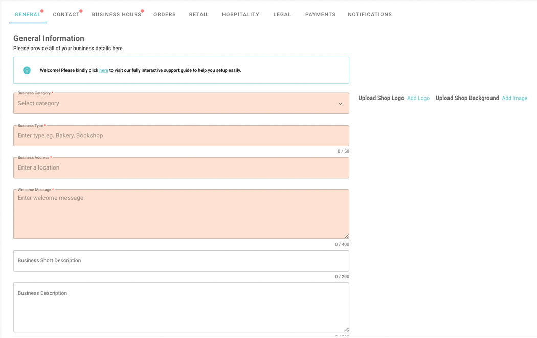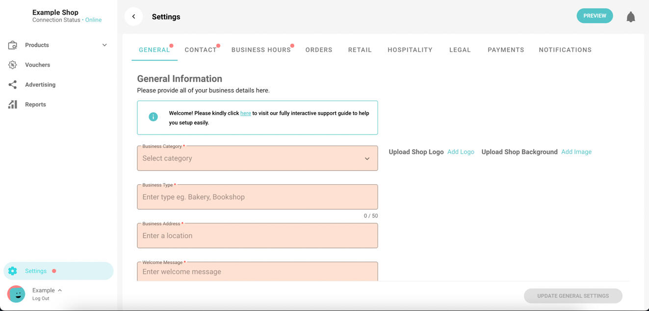 1. When you first sign into the dashboard, you will be taken straight to the general settings page. You will need to fill in as much of this as possible, but at least all those with red asterisks: