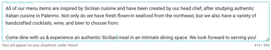 7. Business Description This displays when you click ‘About’ on your shop, so this is where you can put in more in-depth information and the story behind your business here. If you don't have time, you can put in the same information as your welcome message.